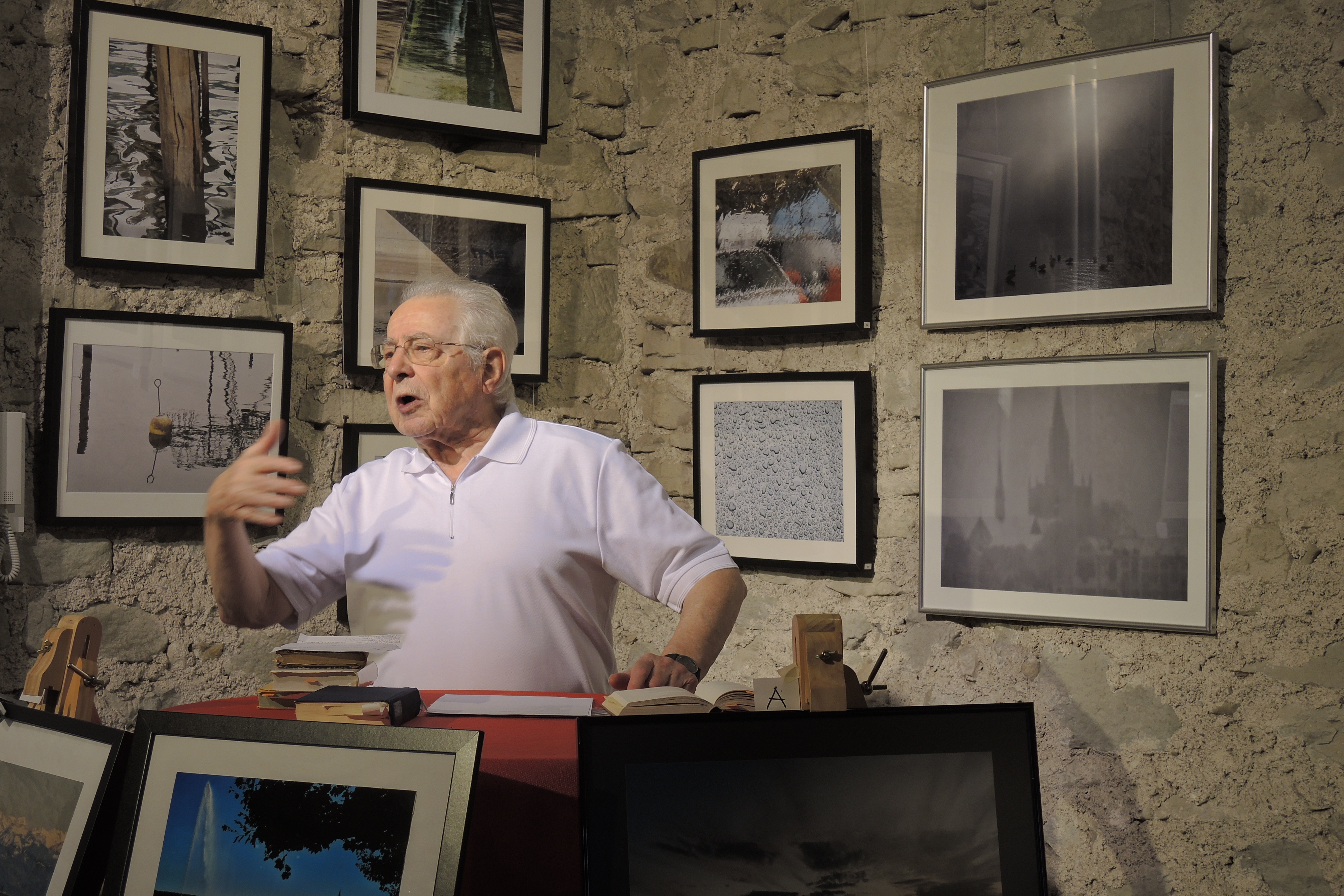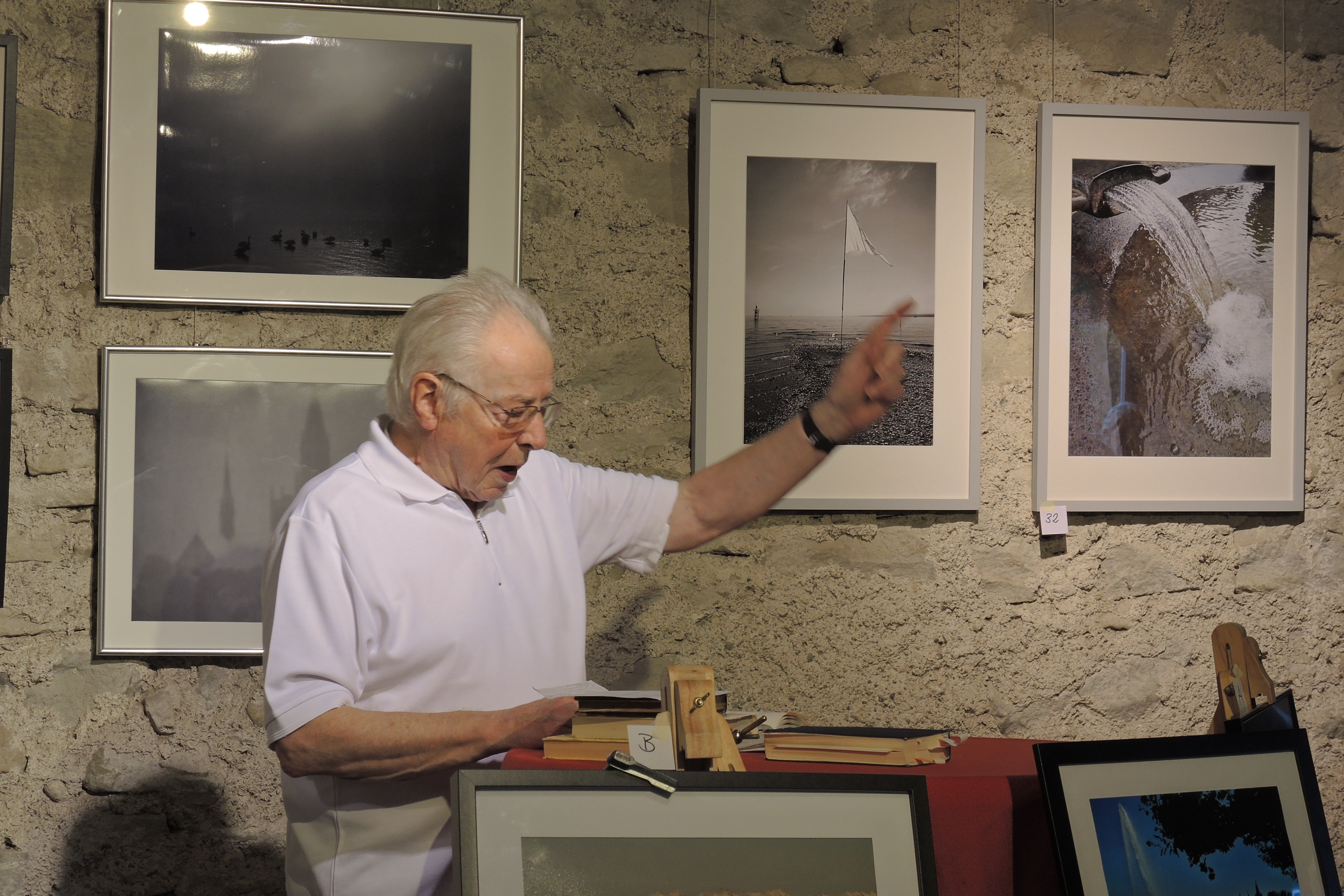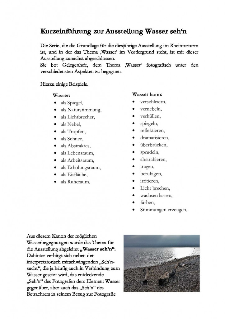Erstens, der Bezug vom fotografisch aufgearbeiteten Thema ‚Wasser‘ zu aktuellen Problemen des Umweltschutzes, wie ihn Herr Prof. Gaier bei der Vernissage hergestellt hat.