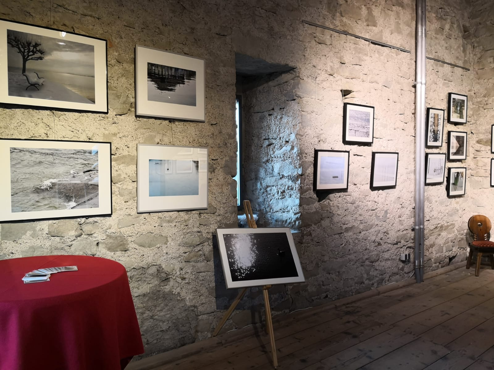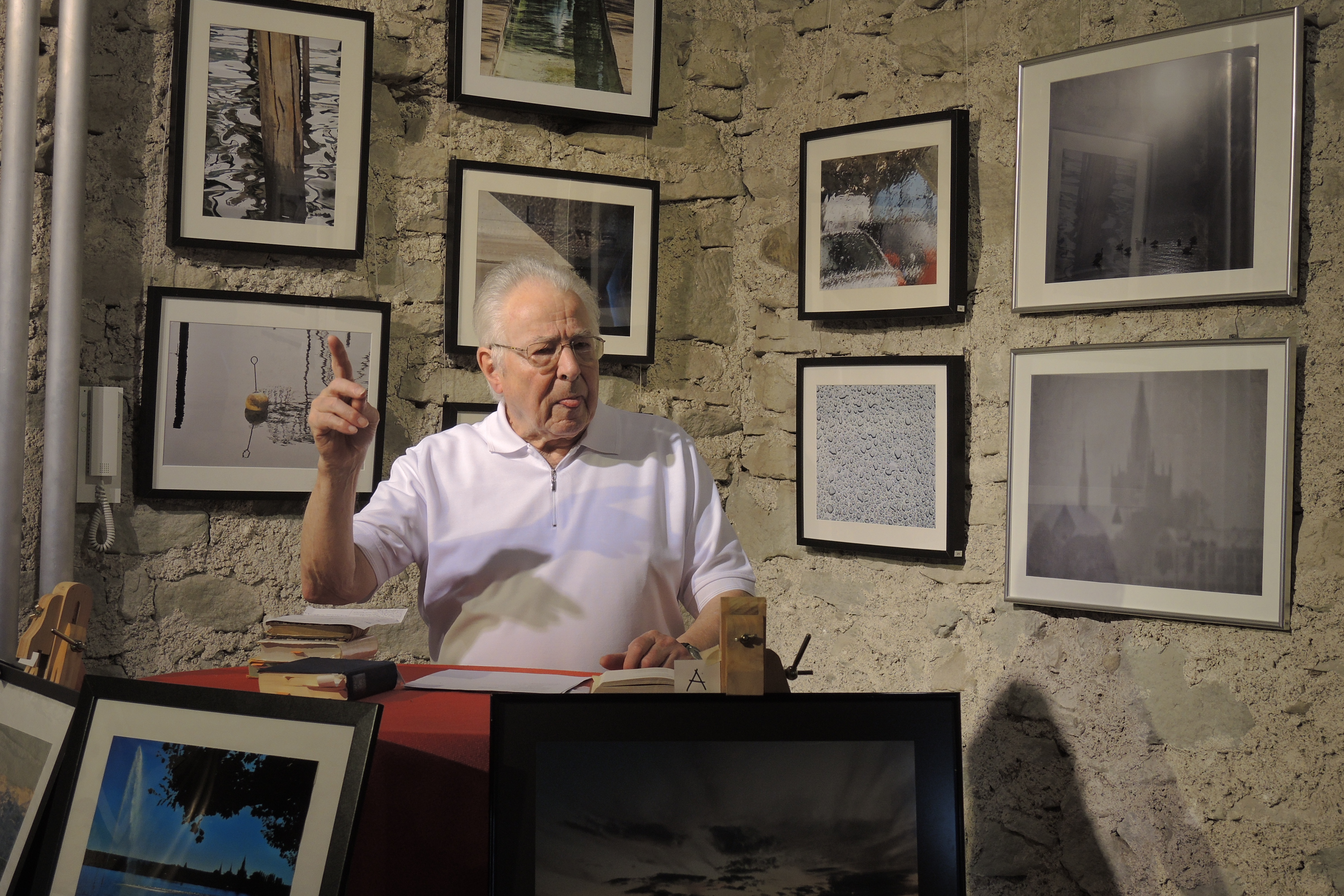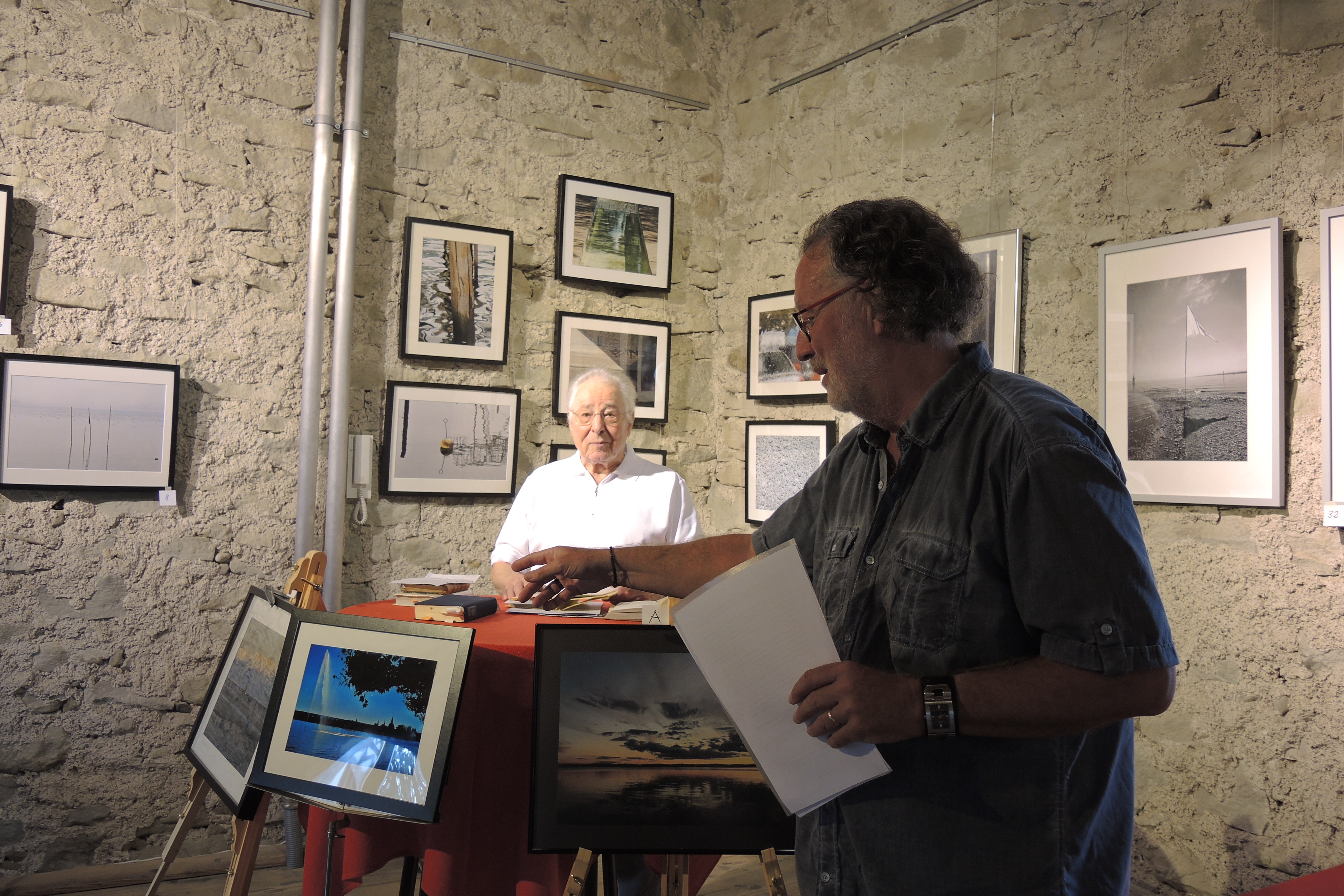 Herr Gaier und ich sind dazu im Rahmen der Vorbereitungen anhand einer Art fotografischem Skizzenbuch viele Wassermotive durchgegangen, auch solche, die es nicht in die Ausstellung geschafft haben, und es war für mich beeindruckend, wie er zu einzelnen Bildern reagierte. „Da fällt mir Meyer ein“, „Da hat doch Goethe…“, usw. waren spontane Reaktionen, die mir zeigten, dass meine Idee eine Verbindung vom Bild zum Text herzustellen funktionierte. Auf die Idee kam ich übrigens durch ein Buch, das ich einmal auf einem Flohmarkt fand: „Bild und Text beim Thomas Mann“(1). In diesem Buch wird aufgezeigt, welche Bilder Mann zu Texten inspiriert haben sollen.