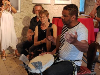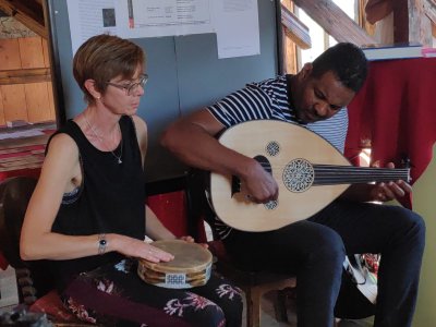 Mohamed Badawi und seine Frau interpretieren Bilder der Ausstellung musikalisch auf afrikanischen Instrumenten