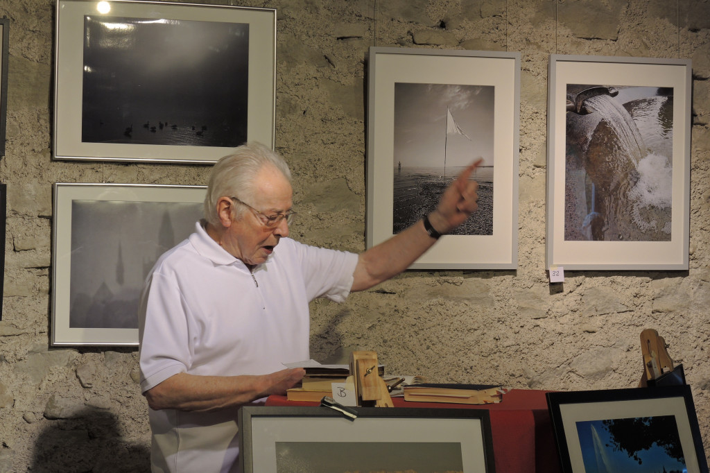 Herr Prof. Gaier sprach im Rahmen der Finissage frei zu vorab Bilder ausgesuchten Bildern, zu denen er einen literarischen Bezug herstellen konnte. Die entsprechenden Gedichte las er dann vor oder trug sie sogar auswendig vor. Anschließend gab er einige Erklärungen dazu, wenn er das für sinnvoll oder notwendig hielt. Damit konnte er auch geschickt auf die Reaktionen im Publikum eingehen. So gelang es ihm, nicht nur eine interessierte, sondern auch eine heitere Atmosphäre herzustellen. Als er das merkte, gab er, ganz außerhalb des Programms, spontan, Morgensterns ‚Fisches Nachtgesang‘ mimisch wieder, um dann zum verabredeten Bild-, Textbezug zurück zu kehren. Toll. Das Publikum war begeistert. Ich auch(!), denn meine Intention, von meinen Bildern ausgehend die Brücke zur Literatur zu schlagen, hat er ohne universitäre Abgehobenheit überzeugend umgesetzt. Daher auch an dieser Stele nochmal ein herzliches Dankeschön an Herrn Gaier – (JR)
